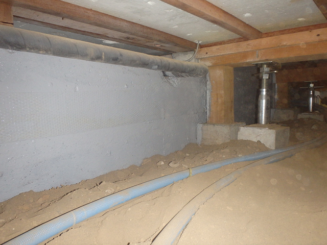 ・床下の環境は良好でしたが、床下の内部基礎にひび割れが発生していました。ひび割れの補修と共に、今後ひび割れが起きないように広範囲に渡って補修・補強工事を行いました。コンクリートの強度は向上し、湿度にも強くなっています。